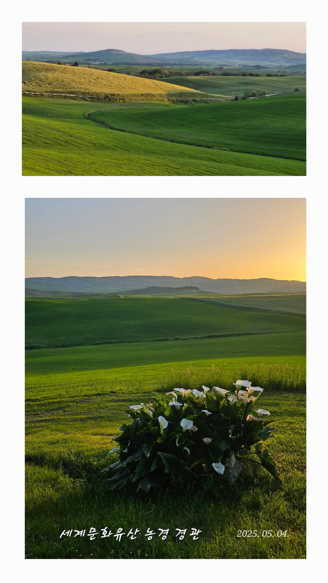 - 초록물결 넘실거리고 초록물든 마음은 자연의 일부가 된듯하다. 꽃좋아하는 나에게는 천상의 화원 더불어 고운 새소리들까지 세계문화유산 지정된 토스카나농경경관은 백문이 불여일견! 두발로 걸어야만 알수있는 느껴지는 그 무엇을 글로 어찌 표현될까..... 꼭 다녀오시라 강추한다.