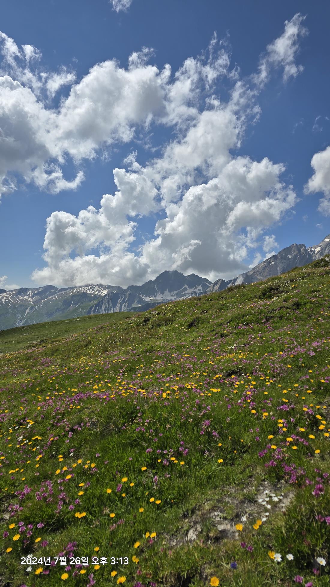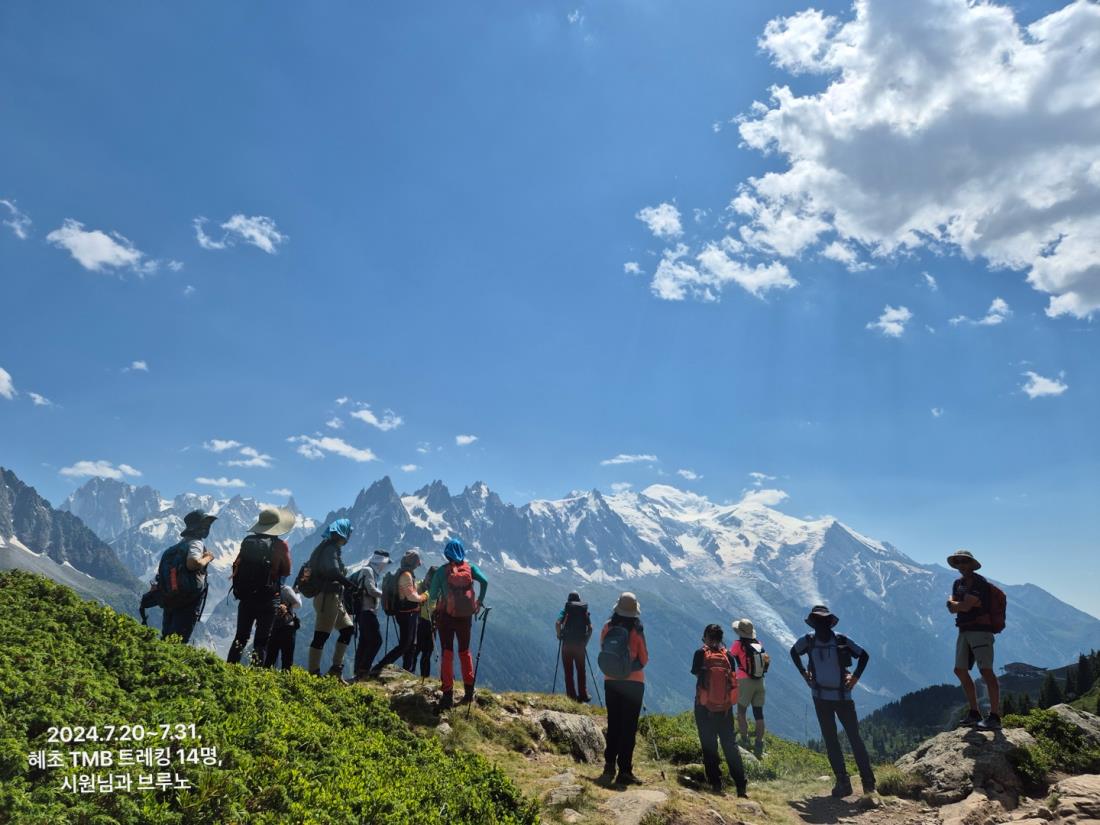 첫날 날씨가 흐려 걱정되었지만 남은 일정 내내 날씨가 좋았고 야생화가 만발하고, 언덕에 올라서면 끝없이 파노라마로 펼쳐져 있는 알프스 산맥을 배경으로 길 위에서 만난 각국의 많은 사람들.. 하이킹 트레킹 트레일러닝 산악자전거등 나이불문하고 열심히 운동하는 사람들을 보며 자극 많이 받고 왔습니다! 현지 가이드 부르노도 유럽팀만 맡다가 우리를 처음 가이드 하였는데 호흡을 잘 맞혀주며 등산화가 애먹은 회원들에게 그의 손은 맥가이버이면서 든든한 가이드였습니다. 프랑스인이라 인종차별이나 거만할까 봐 걱정했는데 전혀 그렇지 않고 따뜻하고 정 많은 사람이었어요. 작별이 아쉬웠습니다. 남시원 대리님은 시원시원하게 우리의 고충을 잘 해결해 주고 작은 것 하나 놓치지 않고 필요로 하는 것들을 옆에서 챙겨줬습니다. 마지막 출국 날까지 땀 흘리고 뛰어다니며 끝까지 열심히 하는 모습에 다음 여행 때도 다시 만나 뵙고 싶었습니다. 부부팀이 5섯팀, 친구 1팀, 우리 모녀 1팀으로 구성된 14명 회원들은 서로 부족한 점들을 채워주며 팀워크를 이뤘고 모두들 호탕한 성격이라 큰 불평들 없이 남시원대리님 안내를 따라줬고 모두들 안전하게 마칠 수 있었습니다. TMB를 위해 아파트23층 오르며 새벽에 일어나 마라톤 연습을 하고, 여행 첫날부터 발뒤꿈치 상처가 심하지만 포기하지 않고 여행 내내 웃으며 끝까지 완주하며, 음악과 함께 자유롭게 춤을 추는 용기 있고 인생을 즐길 줄 알고, 체력뿐만 아니라 아침체조로 정신도 단련시키며, 사진 포즈와 미소로 따라 하고 싶고 팀 분위기를 이끌어 가는 분, 친구와 함께 서로를 맞춰가며 오랜 우정을 단단히 쌓는 분들을 보며 한 분 한 분마다 매력적이고 본받고 싶은 사람들이었습니다. 같이 여행하게 되어서 즐거웠습니다. 등산을 좋아하지만 해외 트레킹은 처음인데 광활한 대자연 속에서 처음 본 분들과 팀워크를 이루며 함께한 시간 속에 많은 것을 학습한 시간이었습니다. 모녀지간 트레킹 여행으로 혜초 TMB 추천합니다.