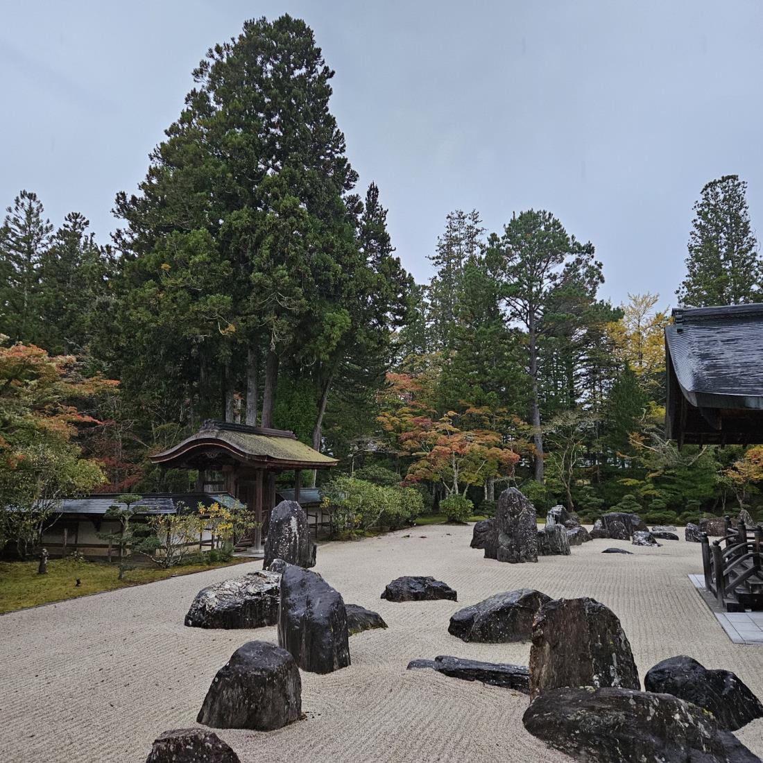 고야산 금강봉사 사찰정원에 서 있다. 돌과 모래로 山水를 표현하였고