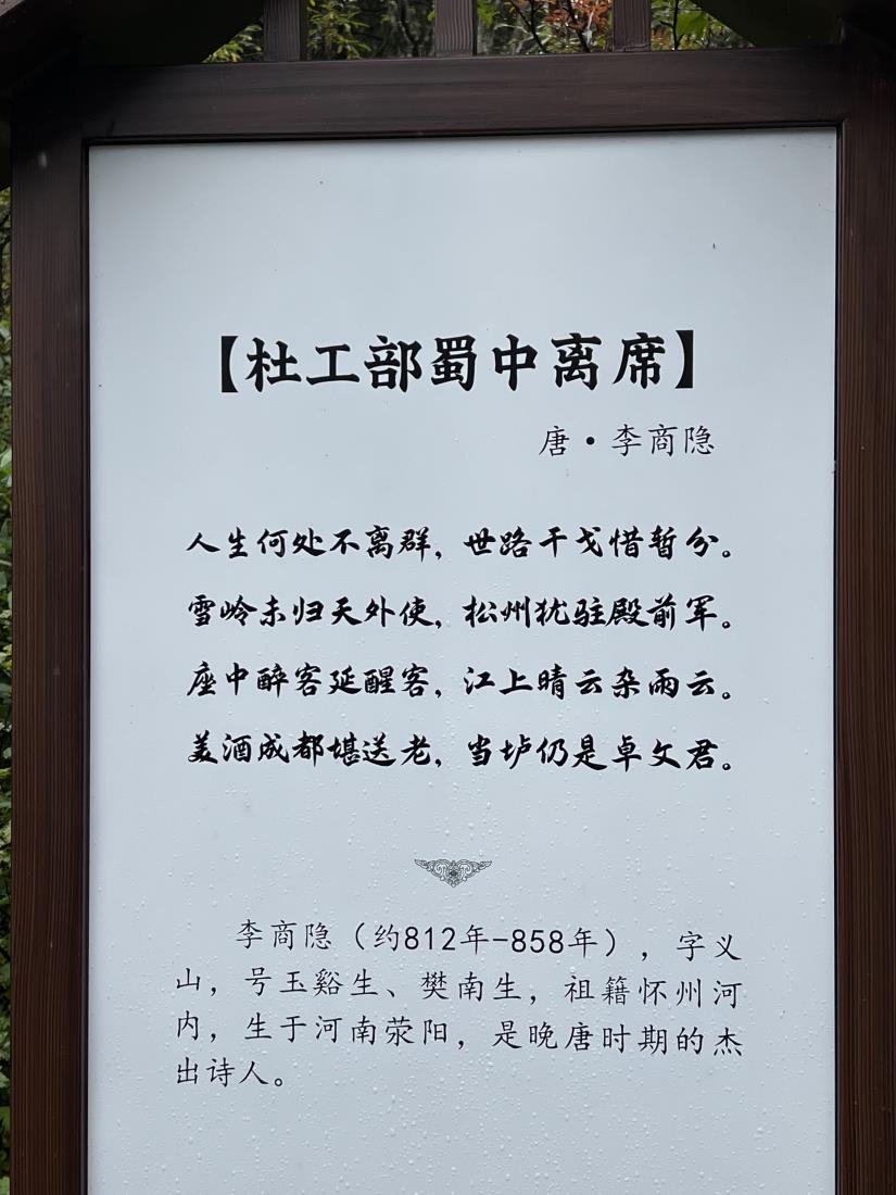 사천성 특산주인 노주노결(?)이란 술 한 병을 사들고 귀국하면서 황룡구 길에 죽 늘어서 있던 옛 시인의 시 중 한편을 마지막으로 이번 구채구/황룡구 트레킹 여행의 감상을 대신할까 합니다. 당나라의 유명 시인 李商隱의 "杜工部蜀中離席"이란 시입니다.
