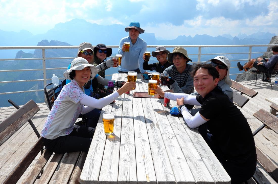 *상품명: 돌로미테 알타비아 No. 1 트레킹 11일 올해 3월 둘째 까지 출가 시키고 나니 뭔지 모르게 인생 숙제를 마친 기분 이었다. 나를 위한 버킷 리스트를 만들어 보고 그중 하나인 '이탈리아 돌로미테 알타비아 No.1 트레킹'을 신청 하였다. 내 나이와 등산 경력을 고려 해볼때 많은 망설임이 있었지만 더 늦어면 못갈것 같아서 일단 가기로 마음 먹었다. 다행히 남편과 같이 갈수 있어서 걱정이 덜 되었고 할수있는한 체력훈련을 하였다. 매일 걷고 지리산 종주를 하기위해 산장에서 이박삼일 지내보았다. 지리산 산장 에서의 경험은 돌로미테 트레킹 짐을 꾸릴때 도움이 되었고 실제 트레킹시 8명과 자야 하는 상황에서도 상당히 도움 되었다. '돌로미테No.1트레킹'은 이천미터 이상의 산장에서 새벽을 맞이 하는 즐거움을 주었다. 매코스마다 환상적인 풍경과 고단한 여정을 마무리 한후 마시는 맥주 한잔 또한 큰 즐거움이었다. 우리 팀은 단출하게 8명이 출발 하여 한테이블에서 식사를 같이 할수있어 분위기가 더 좋았던것 같다. 모든곳이 다좋지만 '스코이아톨리 산장' 에서본 '친퀘토리'가 친근하고 아름다워 좋았다. 끝없이 펼쳐진 야생화들판, 친퀘토리의 멋있는새벽일출 , 누볼라우산장에서의 파노라마 풍광등 좋았던 기억이 많은 산장이다. 또한 스코이아톨리 산장에서의 식사는 모든 산장중 제일 맛있는것 같았다. 제일 못걷는 나를 배려해 항상 기다려 주시고 신경써 주신 임석환 대리님께도 감사 드린다. 친절 하시고 모든 팀원 한명 한명 챙기시는 자상함과 배려는 감동 이었다. 그외 같이 트레킹 하신 우리 팀들 모든분께 감사드린다. 유쾌하고 즐거운 분위기를 이끌어 주신 세분 친구분들 우정 또한 트레킹의 즐거움중 하나였다. 처음 잤던 비엘라 산장의 불편함조차도 여행의 색다른 묘미였다. 혜초 여행사 화이팅!!!