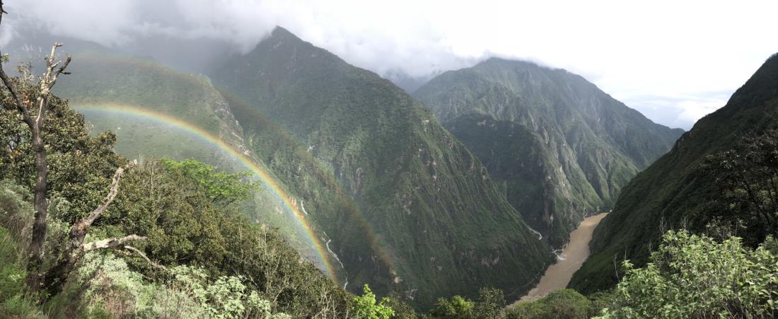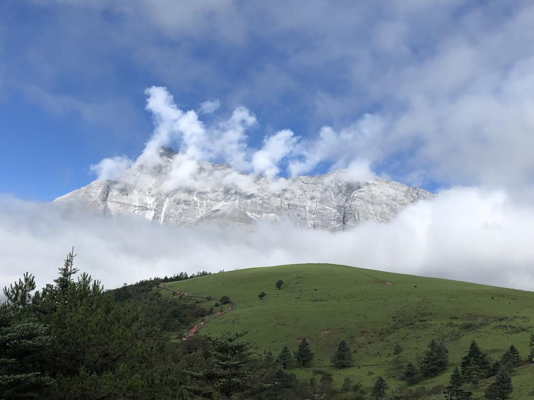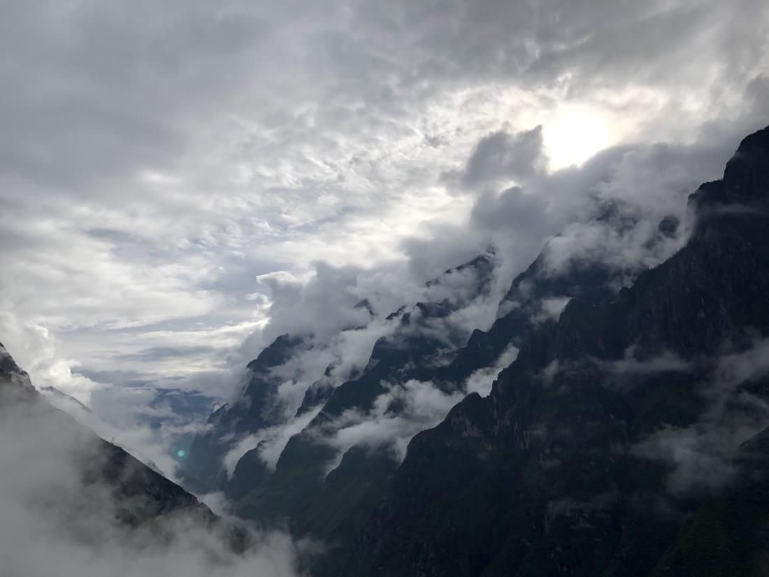 날이 잔뜩 흐리고 구름이 잔뜩 끼고 이따금씩 비가 오는 우기여서 멋진 풍광은 글쎄~하고 기대를 접었었는데 차마고도를 걷던 첫날 쌍무지개가 우리를 반겨 줬고, 다음날 아침 비온 뒤 마법의 연기처럼 피어오르는 옥룡설산의 신비한 구름쇼에 감동했으며 모우펑 케이블카 하자장에 내리자마자 잠시 하늘이 걷히며 짠하고 나타나는 옥룡설산에 감동했습니다.