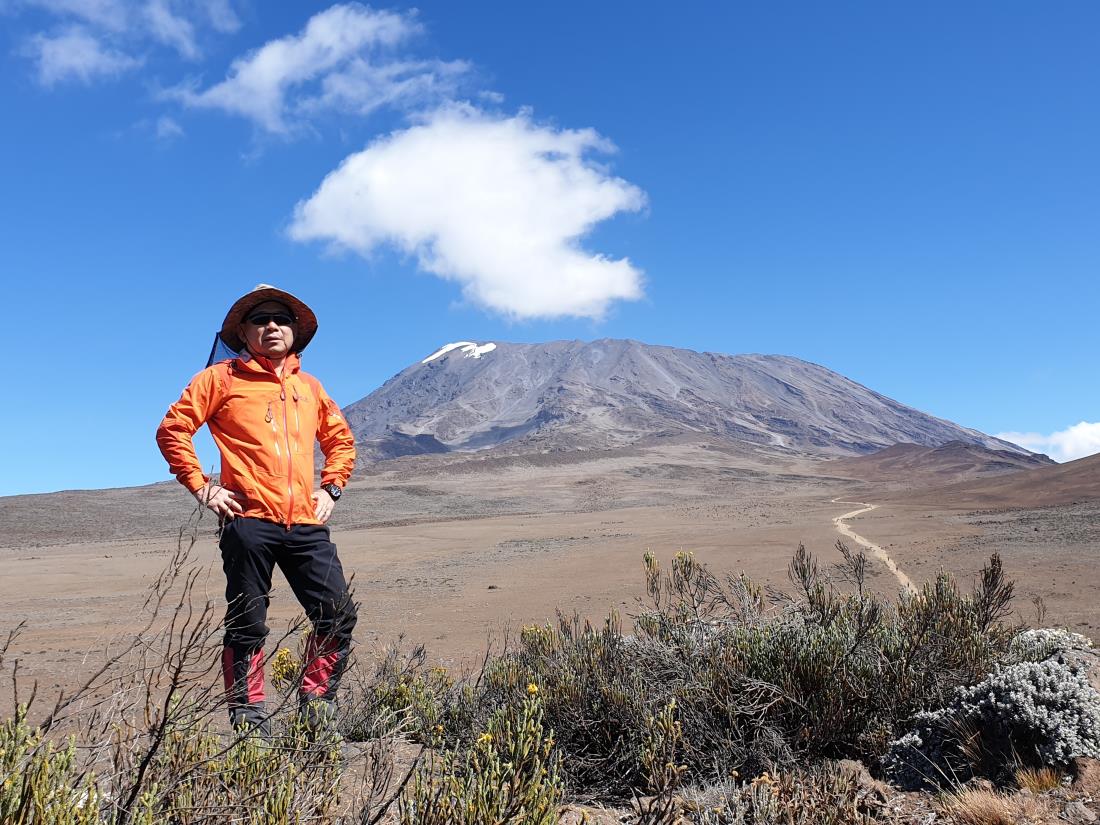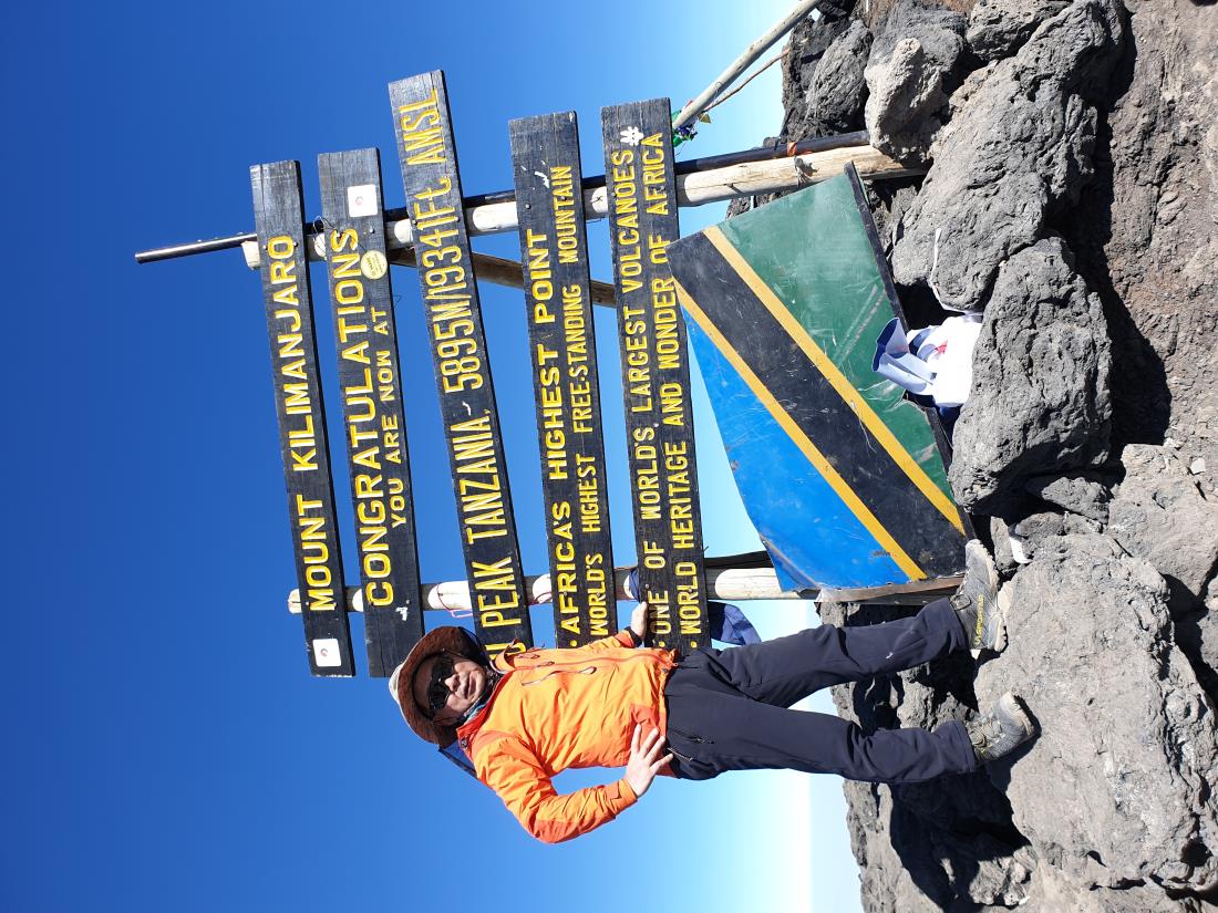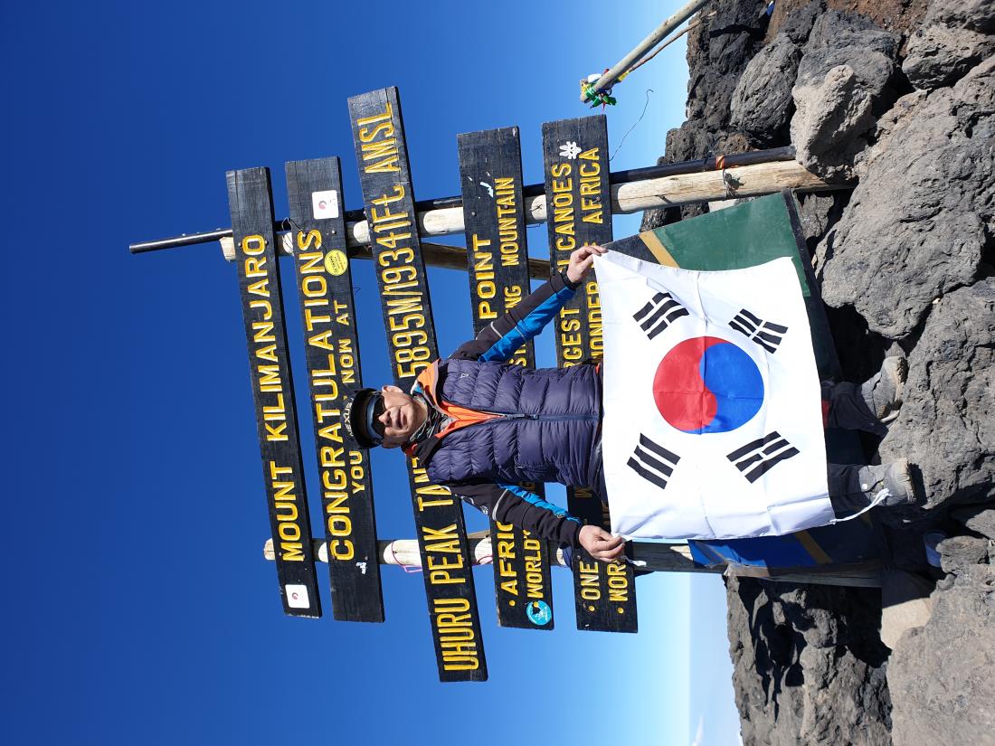 나는 6200m 임자체를 등반 했기 때문에 별로 생각하지 않고 예약을 했다. 임자체틍반 처럼 2중화를 신지 않아도 되고 6,000m 이하이니 내 나이가 그때 보다 더 먹었어도 수월 할 것 같았다. 그런데 출발 이틀 전에 목이 아프더니 본격적인으로 감기가 걸린 것이다. 출발을 미룰수도 없고, 찝찝한 마음으로 출발했다. 킬리만자로 등반 이틀 뒤 만다라 산장에서 코를 세게 풀다 코피가터졌는데 지혈이 안되는 것이었다. 전날 감기약에 아스피린을 넣어 먹은 것이 원인이다. 휴지로코를 막고 호롬보산장을 오르는데 코피가 지혈이 안돼 톡톡 떨어져 많이도 흐르는것이었다 좋이로 코피를 막으면 금방 종이가 졌고 옆으로 흘러 내린다. 점심때까지 계속 코피를 흘렸나보다. 너무 않이 흘려 어지러웠다 지혈이 된 뒤에는 누런코가 계속나와 코로 숨을 쉴 수 가 없었다 마지막날 키보산장에서 초저녁에 자고 자정에 일어나기위해서 졸린감기약을 독하게 먹고 일찍 잠들고 12시에 기상하여 등반하기 시작했다. 겨속 가파른 오르막으로 5,000m를 넘으니 자기전에 먹은 감기약 때문에 졸리가 시작했다 산악행군 중에 내가 꾸벅꾸벅 조니 가이드가 나를 뒤로 빼고 쉬게 하였다. 잠이 쏟다져 정신을 차릴수가 없었다. 또한 몸살 기운이 있어 허벅지를 바늘로 찌르는 것 . 같아 오르막을 걸을수가 없었다. 졸음을 쫒으며 뒤쳐.져 조금 오르다 쉬고 하는 동안 일출이 시작 되었다 햇빛을 맞으니 잠은 달아 나고 제정신이 돌아 오고 있었다. 우여곡절 끝에 길만스포인트에 도착했다. 고곳에서 2시간을 더 가야 정상이다. 가이드가 내러 가자고 한다. 정신이 이제야 돌아 오기 시작 했다. 여기까지 올라 왔는데 정상은 가야지. 그동안 정신은 없어서도 중간에 내려갈 생각은 추호도 없었다 허벅지는 계속 쑤시지만 정상인 우후르피크를 향해 걸었다. 드디어 정상을 밟았다.
