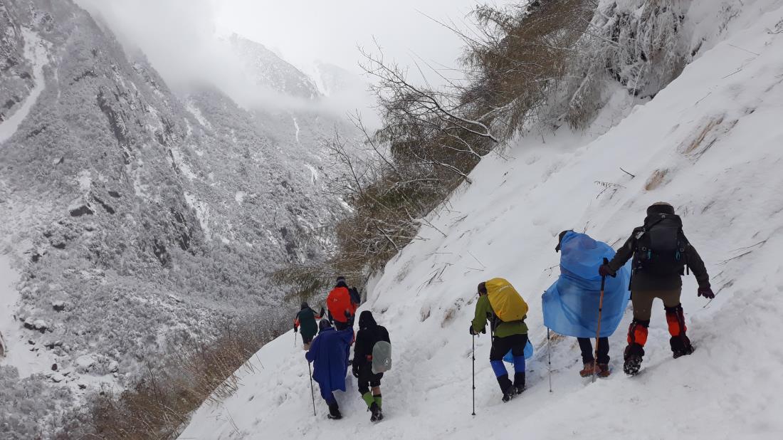 날씨까지 너무 좋아서 여기 오신 분들은 다들 삼대에 걸쳐 음덕을 쌓은 분들 아닌가 라는 자화자찬이 끝나기 무섭게 시누와부터의 일정은 아침부터 여름비같은 비가 오더니 도반를 거쳐 히말라야 롯지에 다달았을 때는 싸락눈이 이미 함박눈으로 바뀌어 환상적인 한겨울의 나무들의 눈꽃 잔치를 체험하는 변화를 통해 우리들은 하루에도 사계절을 다 겪는 것 같은 분위기에 기분이 더욱 더 업되는 느낌을 받았다. 데우랄리가는 길은 더욱 더 고도가 높아지고 엄청난 눈으로 설국을 이룬 상태라 유능한 가이드의 안내에 따라 조심 조심 험한 길을 걷고 걸어 롯지에 도착했다. 사람들로 붐비는 데우랄리 롯지에서도 타국산악인들의 부러움을 사는 '왕의 한식' 밥상을 받고, 얼마 안 남은 이번 여정의 최고 하일라이트인 MBC와 ABC에 도달할 꿈을 안고 잠을 자는데 간밤에 엄청난 폭풍 소리에 놀라 깨어보니 닫힌 문사이에 눈이 수북이 들어와 자는 침대에 스프레이를 뿌리고, 놓인 신발을 눈으로 다 덮을 정도였으며, 밖에 나가 보니 걸어놓은 우비와 배낭 커버는 이미 다 날라가고 없었다. 불안한 마음에 전전반측,비몽사몽타가 엄청난 산사태 소리가 같은 굉음을 듣기도 하면서 이윽고 아침에 나가 보니 이미 눈은 사람 허리 높이까지 쌓여 있었다. 심상치 않은 분위기 속에 아침을 먹고 눈발이 잦아들기를 기다리다 올라가는 것이 힘들다고 인솔자님이 결론을 내리고 눈이 그치기를 기다려 점심쯤에 하산하자고 해서 선잠이 들었는데, 갑자기 하산 명령이 났다. 더 눈이 쌓이면 오도가도 못하는 상황이 되니 지금 하산하는 팀들을 따라 우리도 하산하자고 해서 10시 30-40분 하산을 시작했다. 하산한 지 얼마 안돼서 눈사태를 만나 데우랄리로 돌아오는 팀과 만나서 상황을 판단한 가이드님들이 당신들의 경험을 살려 최대한 빠르게 위험지역을 벗어나도록 해서 우리팀은 안전하게 히말라야 롯지까지 신속하게 내려왔더니 엄청난 산사태 흔적을 확인할 수 있었다. 마치 전쟁터를 벗어나는 극도의 불안감에 휩싸여 내려온 길은 평생 잊을 수 없는 경험이 되었다. 나중에야 명확히 알았지만, 불과 30여분 이내 시간 속에서 누군가 먼저 가고 나중에 갔느냐에 따라 생사가 결정되는 모골이 송연한 경험을 하게 되었다.