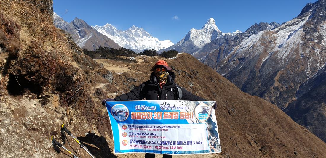 2017년, 안나 푸르나, 2018년 랑탕 & 체르코리, 2019년 1월 12일~27일(14박 16일) 칼라파타르 & EBC 트레킹을 다녀왓습니다. 힘겹고 두려운 트레킹이었지만 혜초와 함께해서 가능했습니다. 박진형 대장님의 탁월한 지도력 덕분에 대원들은 모두 행복한 여행을 하였습니다. 날씨 또한 좋아서 산행하기에 아주 좋았습니다. 박진형 대장님께서 직접 만들어 주신 행운의 팔찌 덕분이기도 합니다.^^) 다시 한 번 무사히 트레킹을 마치고 돌아온 것에 감사드리며 혜초여행사의 무궁한 발전을 기원합니다. 아울러 함께했던 동료분들께도 충심으로 감사의 말씀 올립니다. 박진형 대장님과 현지 가이드 지반 님, 룸메이트 곽순상 님으로 삼행시를 읊어드렸는데 이 자리에서 다시 올려봅니다. 모두 행복한 날 보내시기 바랍니다. (박)수를 보냅니다. 행운의 팔찌를 선물한 그대 (진)정 그대는 우리의 멋진 가이드입니다. (형)님, 다음 여행도 혜초 트레킹, 아시죠? (지)금 우리는 하나가 되었습니다. (반)드시 멋진 칼라파타르, 히말라야의 추억을 가슴에 새기고 오겠습니다. (곽) 속에 담긴 보석도 아름답지만 (순)수한 영혼, 당신이 더 아름답습니다. (상)서로운 히말라야의 기운을 우리 함께 나눠요. ♡♥ ************************************************************* 정문규 삼가 올림