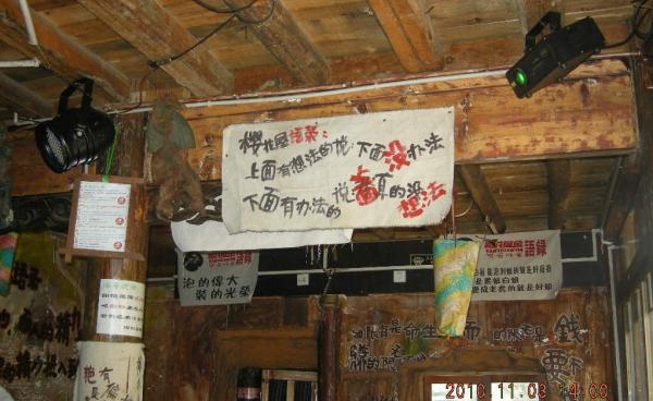 여강고성에 제일 먼저 생긴 첫 번째 주점. 한국인이 운영하는 사쿠라 김의 까페에 걸린 글, “윗사람의 생각을 아랫사람은 따르지 못하고 아랫사람의 행위를 윗사람은 이해하지 못한다.”라는 의미 같은 데, 산업화가 진행 중인 중국의 고민을 표현한 것 같다.