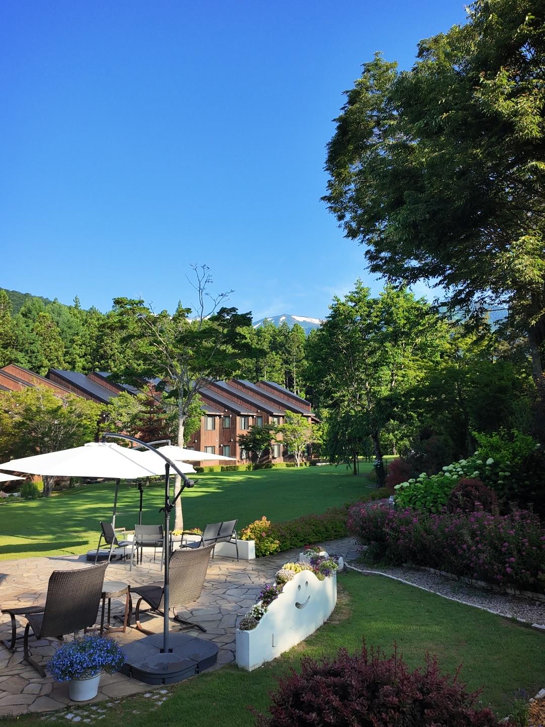연박을 하는 하쿠바 지역 리조트는 입구에서부터 들뜨게 했다. 웨딩채플이 있었고, 산책로도 보였다. 밤 2시부터 장작을 때는 작은 온천도 있었다. 새벽에 걷다가 서늘해져서 족욕을 했다. 새들은 노래하고, 발은 따뜻해졌다. 해가 떠오르며 높은 설산 봉우리가 노랗게 물들었다. 마치 마터호른처럼.