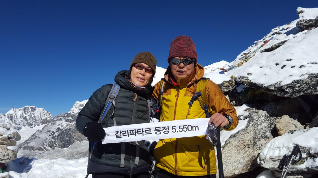 ◇2018년 4월 12일(제10일차) Kala Patthar(5,550m)를 오르기 위해 새벽 4:30에 기상을 하였다. 마늘스프로 간단히 마시고 출발하기로 하였다. 5:00에 출발을 하여 7:30에 5,550m Kala Patthar정상에 올랐으니 2시간 30분이 걸린 셈이다. 오르는 길은 온통 흰 눈으로 덮혀 있고, 찬 새벽 공기와, 맑은 하늘에 눈부신 에베레스트의 풍광은 정말 장관이었다. 검은 바위산인 Everest산 위에 피어나는 아침 햇살과 하얀 눈구름은, 이 아침에 여기 아니면 볼 수 없는 풍광이다. 초오유, 고쿄리, 촐라체, 쿰부체, 창체, 마칼루, 로체, 눕체, 임자체, 아마다불람, 캉데카, 탐세르쿠까지 웅장한 희말라야 설산들이 한눈에 다 들어오지 않고 양 사방에서 버티고 있다. 특히 로체와 눕체가 가장 가까이서 거대한 만년 설산군 파노라마를 이루고 있다. 이 거대한 산속에서 인간은 하나의 작은 미물에 지나지 않으며, 조그만 티끌에 지나지 않는다. 겸손해야 한다. 거대한 자연 환경 앞에서 머리 숙여야 한다. 감히 뭐라 표현을 할 수가 없다. 그저 정신없이 기념 촬영만 몇 컷 할뿐이다. 하산은 8:00에 시작하여 9:15에 도착하였으니 1시간 15분 만에 도착을 하였다. 가슴이 멍하고 정신이 혼미하다. 10:00에 미역국으로 아침을 할려고 하니 고산증과 피로감에 견딜 수가 없을 정도였다. 아침 겸 점심인데 먹는 둥 마는 둥 하고 11:00 귀가를 위한 하산을 시작하였다. 고도도 내려가고 등정을 마쳤다는 생각에 마음은 가볍다. 13:30분이 되어서 Lobuche의 Oxygen Altitude Lodge 에 도착하여 누릉지, 감자, 달걀로 허기를 달랬다. 14:20 하산을 하기 시작했는데 계속 엄청난 눈이 내리기 시작했다. 오후는 내리는 눈에 의해서 조망은 거의 없었다. 약 30분을 눈속을 해매면서 내려오니, Thokla Pass를 지나 올 수 있었다. 그래도 눈은 계속 내렸다. 눈이 계속 내리는 바람에 쉬지 않고, 내려 오는데 2시간 20여분 만인 16:40 경에 오늘의 숙소가 있는 Pheriche 의 Hotel Pumori Lodge 무사히 도착을 하였다. 오후 내내 눈이 내렸고, 밤에도 계속 눈은 내렸다. 그러나 하산길이기에 부담은 없는 저녁을 보낼 수 있었다. 오늘 저녁은 만두와 부대찌개였다. 네팔식 찐만두, 군만두 모두 맛있게 먹었다.