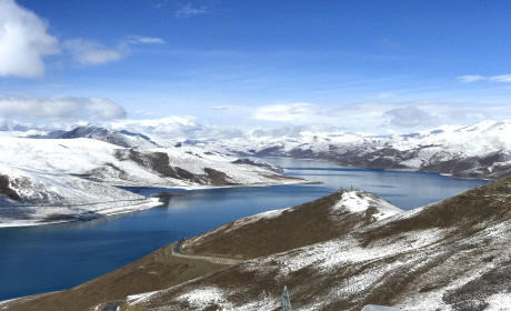 티벳의 4대 호수 (남쵸 호수, 마나사로바,라모라쵸,얌드록쵸 호수)중 하나로써 짙은 비취 빛의 물 때문에 '푸른 보석'이라는 애칭을 가지고 있습니다. 산 위에 쌓였던 눈들이 녹으면서 형성된 호수로 동에서 서까지 130Km, 남에서 북까지 70Km길이 이며 이곳의 고도는 무려 4,482m에 달합니다. 굽이굽이 이어진 산자락을 따라 자리한 얌드록쵸를 바라보고 있노라면 몽환적인 느낌마저 듭니다.