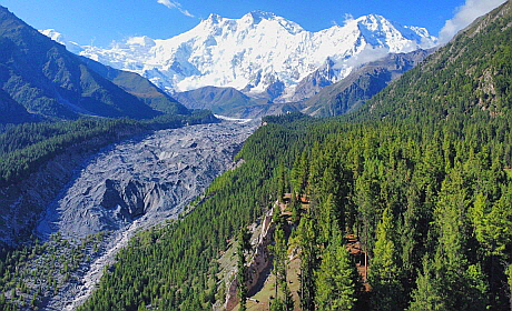발토로빙하를 배경으로 비아포 강기슭 좌측 사면의 푸른 숲지가 형성되어 있는 곳이 빠유입니다. 메마르고 삭막한 풍광
