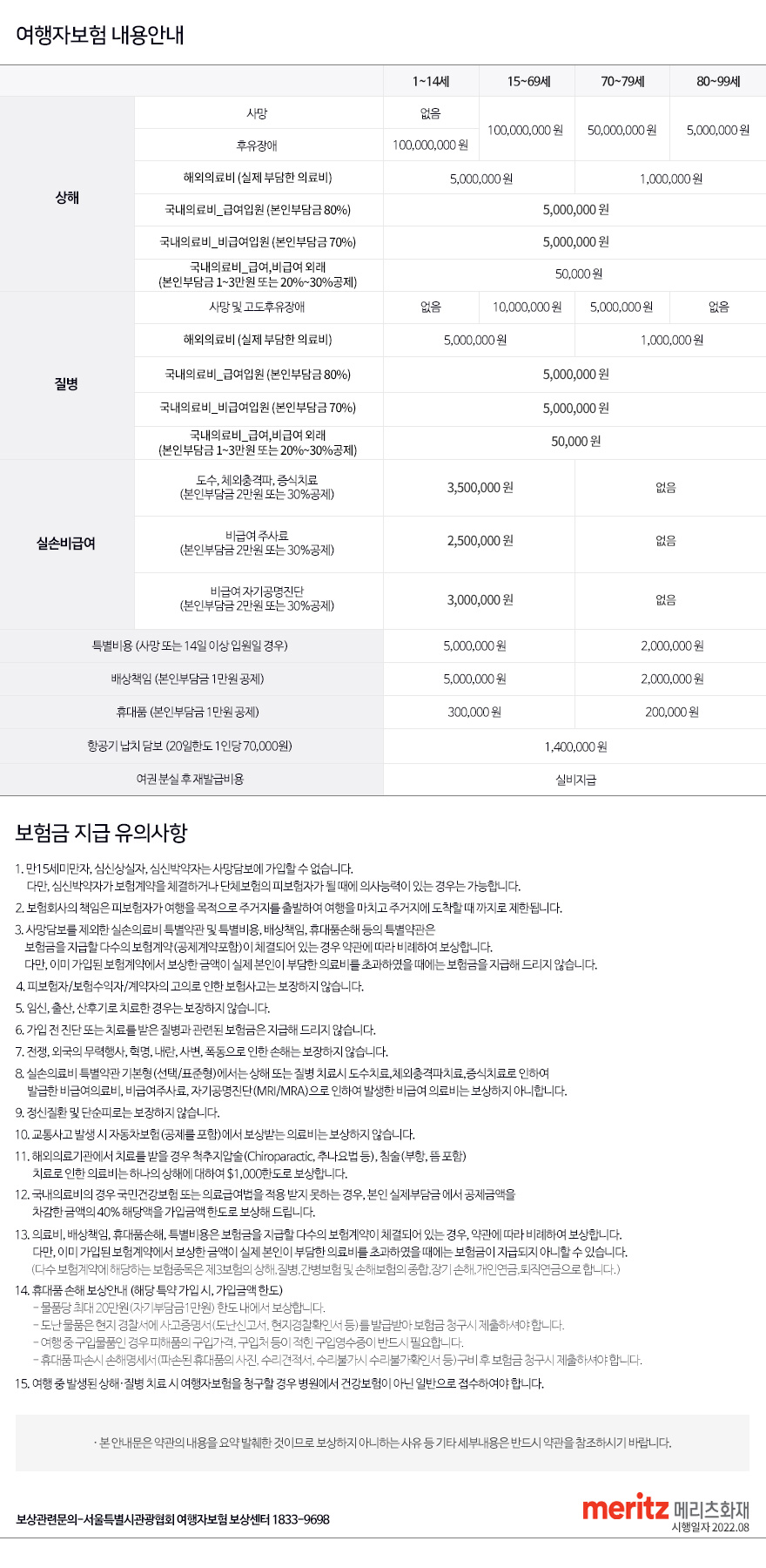 여행자보험 상세 보장내역과 약관은 홈페이지 및 안내문을 통해 확인하실 수 있으며 보험의 보장 내역 확장을 원할 때는 보험사에 직접 문의해 주시기 바랍니다.