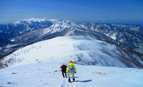 ▲ 니시호구치역 전망대에서 바라보는 하얀눈으로 덮인 일본 100명산 '가사가다케(2,898m)'를 보며 트레킹 준비를 합니다.