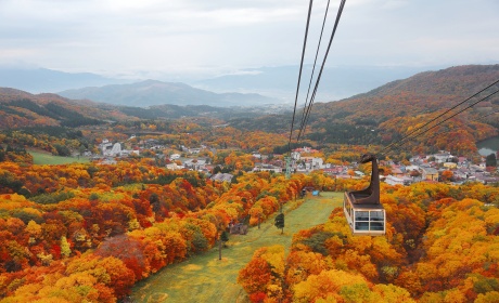 ▲ 갓산 스키리조트까지 전용차량으로 이동 후, 우에에키까지는 푸른 초원 위 리프트를 타고 이동합니다.